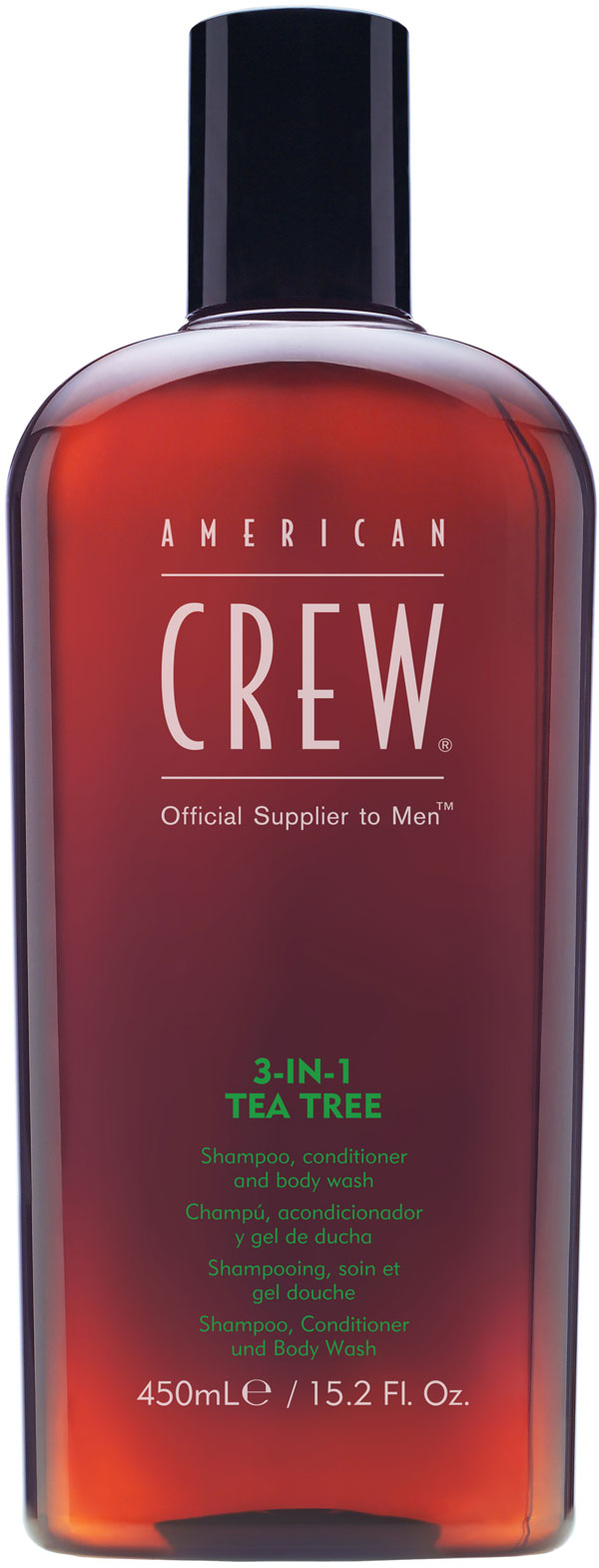 American Crew presenta 3-in-1 Tea Tree: champú, acondicionador y gel de ducha en un solo producto para el cuidado de la piel y el cabello del hombre.