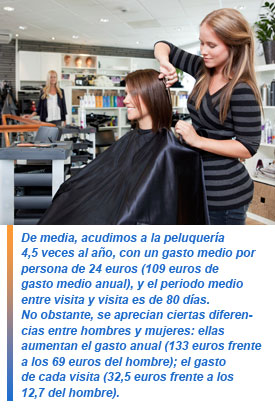 De media, acudimos a la peluquería 4,5 veces al año, con un gasto medio por persona de 24 euros (109 euros de gasto medio anual), y el periodo medio entre visita y visita es de 80 días. No obstante, se aprecian ciertas diferencias entre hombres y mujeres: ellas aumentan el gasto anual (133 euros frente a los 69 euros del hombre); el gasto de cada visita (32,5 euros frente a los 12,7 del hombre); el periodo entre visita y visita (de 80 días para las mujeres frente a los 67 días en los hombres), y el porcentaje total que acude a la peluquería (85% de mujeres frente al 64% de hombres).