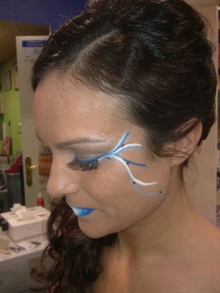 lleva unas pestañas postizas bastante llamativas con brillantes de colores, no se aprecia bien en la foto, por eso cargue bastante la sombra de los ojos