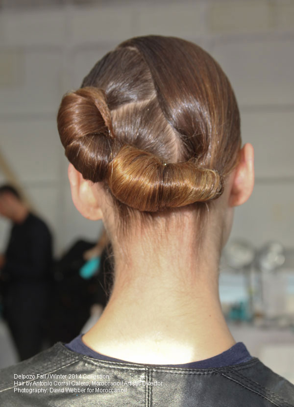 Antonio Corral Calero, director artístico de Moroccanoil, creó un elegante peinado de aspecto futurista que culminaba en un recogido enrollado en forma de cilindro para la colección de Del Pozo para el Otoño/Invierno de 2014. "El cabello es bello, fuerte y dramático y estuvo inspirado por la visión del diseñador del artista italiano Duilio Barnabé. Los peinados son ligeros, elegantes y asimétricos y de formas geométricas redondas” declaró Antonio Corral.