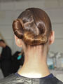 - "Por último, dividí esta cola de caballo unida en el lado izquierdo en dos partes. Giré y enrollé la primera parte de la cola de caballo alrededor de la parte inferior de la coleta izquierda para crear un efecto similar a un tubo redondo vertical y lo fijé con horquillas. Entonces giré y enrollé la parte restante de la coleta alrededor de la sección media de la nuca y la fijamos de nuevo con horquillas".