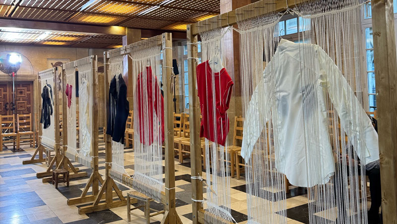 La colección de Sonia Carrasco se presenta en un espacio concebido como una experiencia inmersiva, con una instalación central inspirada en el telar y una actuación en directo que aporta ritmo, emoción y presencia humana al desfile. Un contexto en el que la peluquería cobra un papel clave para completar la narrativa visual del show.