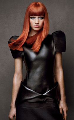 El color de Fringer es el rojizo. Abarca todos los tonos de rojo para rendir tributo a todas las pelirrojas y a todas aquellas mujeres que quieran pasarse al rojo. Fringer es un look joven y moderno para todas aquellas mujeres a las que les gusta ser el foco de atención. "Lo que hace especial a este look es el amplio flequillo cortado en línea recta", explica Armin Morbach. "En las pasarelas vimos flequillos muy cortos, pero un flequillo a la altura de las cejas es más fácil de llevar y se adapta a la mayoría de las mujeres". El estilo de este look es sencillo: las raíces del cabello se secan con la ayuda de un secador y un cepillo redondo, mientras que las puntas se alisan con la ayuda de una plancha. El foco del maquillaje está en los ojos: sombras oscuras para resaltar la mirada y cejas naturales para crear un toque místico. Los labios en tono nude.
