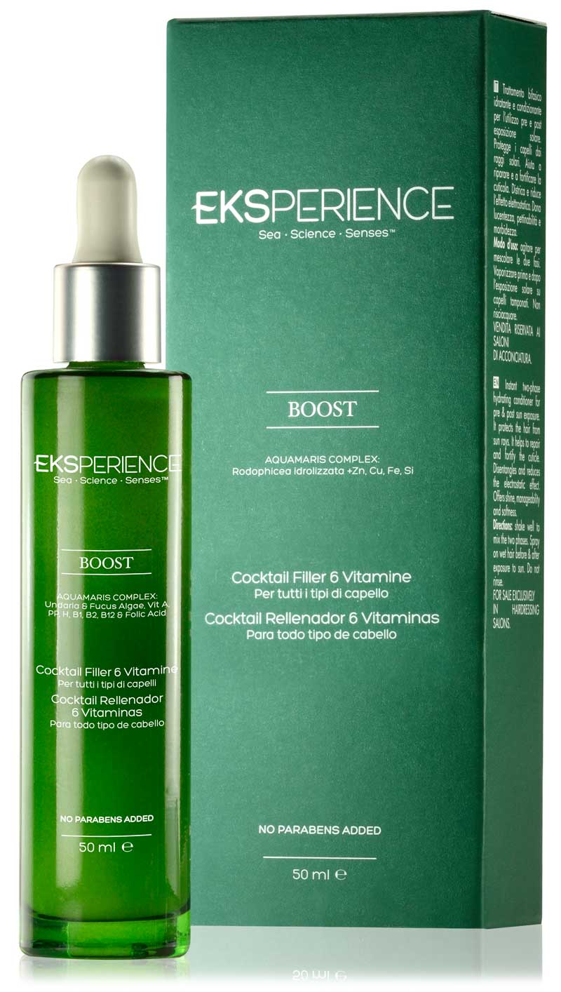 - Boost: línea transversal que otorga vigor al cabello. Se puede utilizar por sí sola o en combinación con otros productos Eksperience. La gama nutre, purifica y recarga cabello y cuero cabelludo.