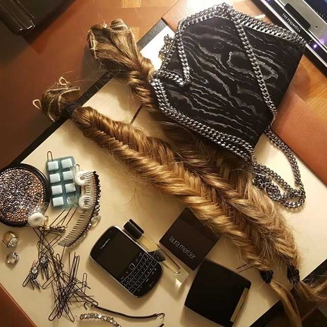 "Los postizos son parte imprescindible de este peinado", explica. "En su caso, se han usado dos del color del cabello para realizar las trenzas".