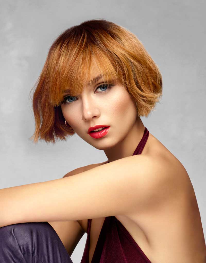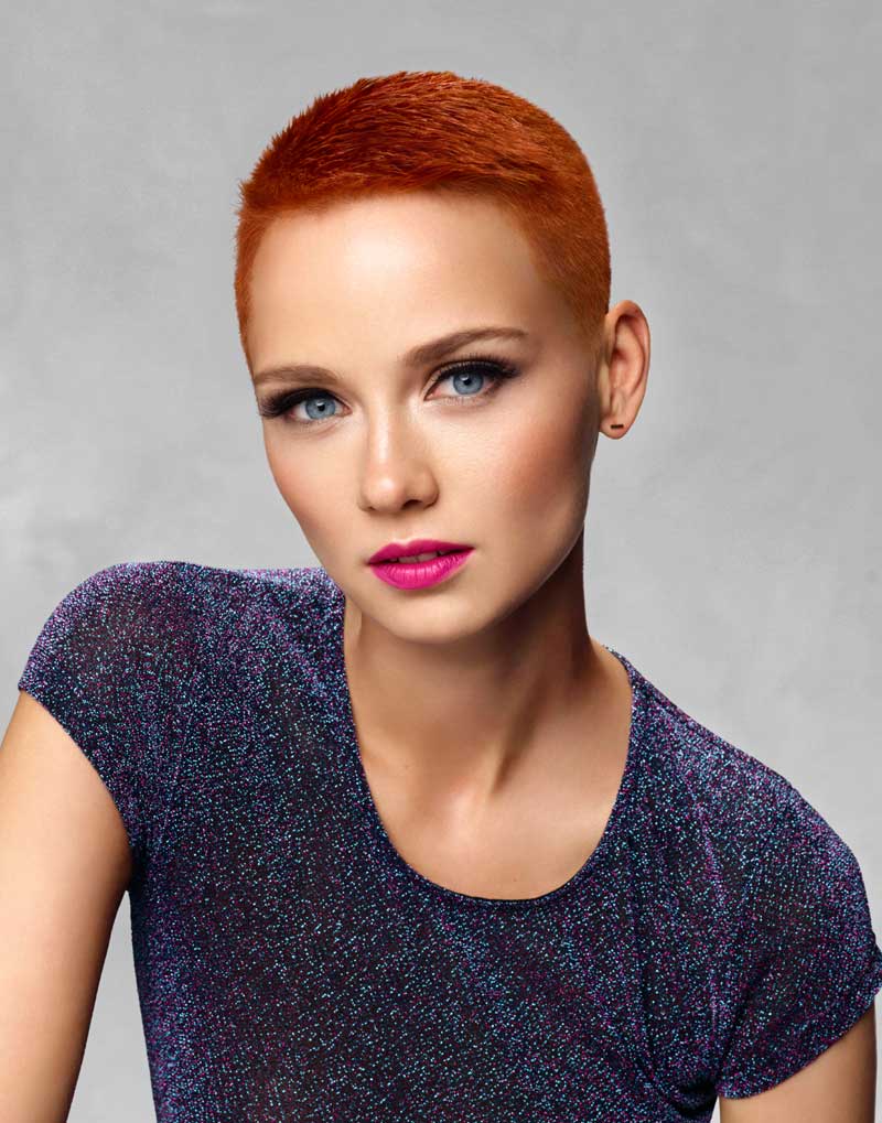 Cobre intenso combinado con un corte agresivo, aunque femenino, que refleja una personalidad atrevida.