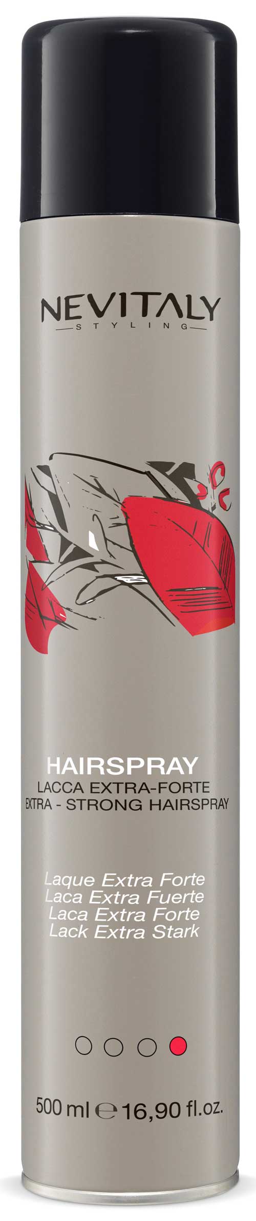 Nevitaly, además, presenta dentro de su línea Styling, Hairspray laca extrafuerte, la cual incorpora el complejo AP-Complez Nevitaly. De fijación ultra fuerte, aporta estructura sin apelmazar el cabello para tocados extremos de larga duración. No deja residuos y se elimina fácilmente con el cepillo.