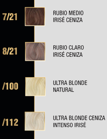 - 7/21 Rubio Medio Irisé Ceniza: color natural y equilibrado que combina un matiz violeta irisado con un reflejo ceniza. Ideal para neutralizar matices amarillos y potenciar un color natural y brillante.