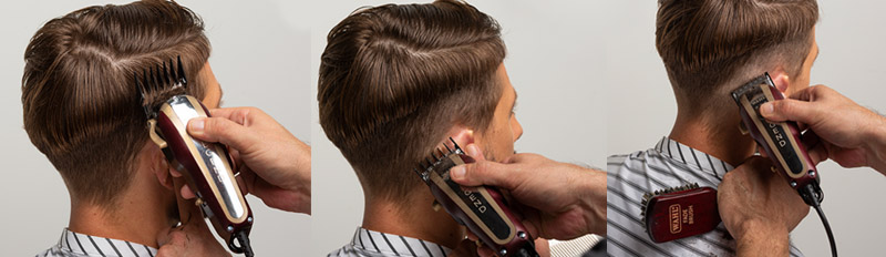 - Paso 2. Con la WAHL Legend y el peine de 3 mm, sigue definiendo la misma longitud hacia las zonas del cuello en los laterales. Nota: Mantenga el pelo de la zona central del cuello más largo.