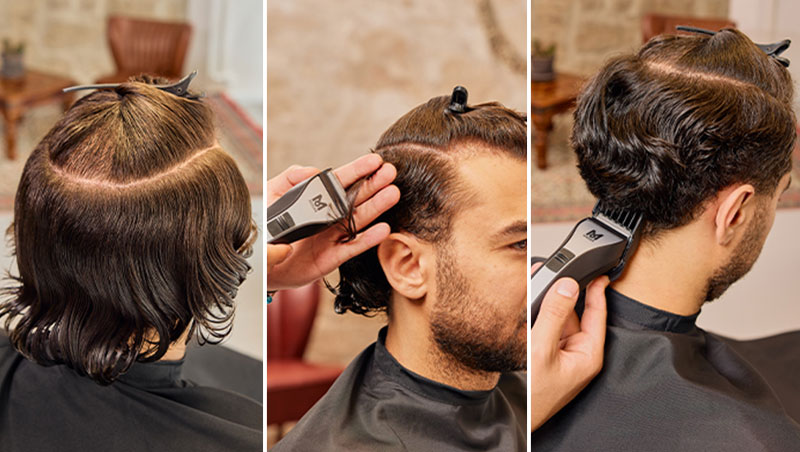 2. Utilizando la CHROM2STYLE y la técnica de la máquina sobre el dedo, los lados se cortan en secciones que van en diagonal hacia atrás desde la parte delantera a la trasera hasta la mitad de la parte trasera de la cabeza (ambos lados deben encontrarse en el centro y superponerse suavemente) para crear un efecto de capas.