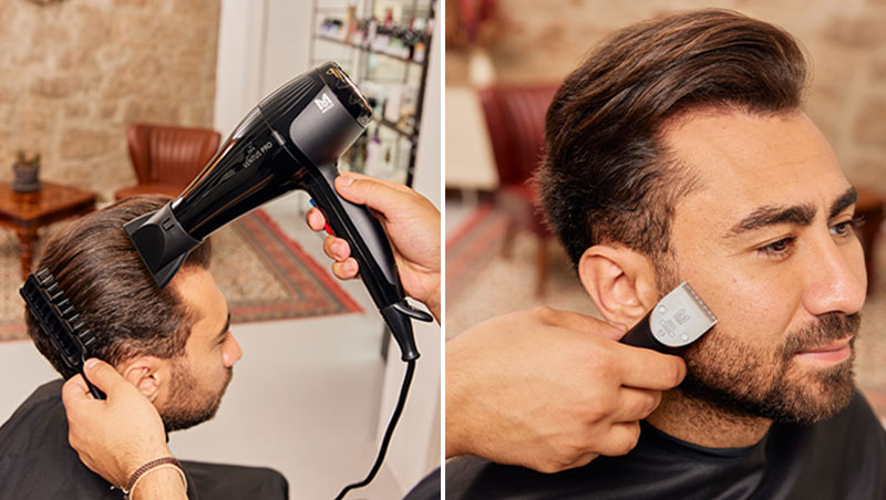 La MOSER CHROMINI PRO 2 aportó unos contornos claros y transiciones de primera clase, mientras que la MOBILE SHAVER logró una textura de piel limpia a las secciones recortadas. Para el proceso de peinado se utilizaró tanto el secador MOSER VENTUS PRO como la plancha CERALINE.