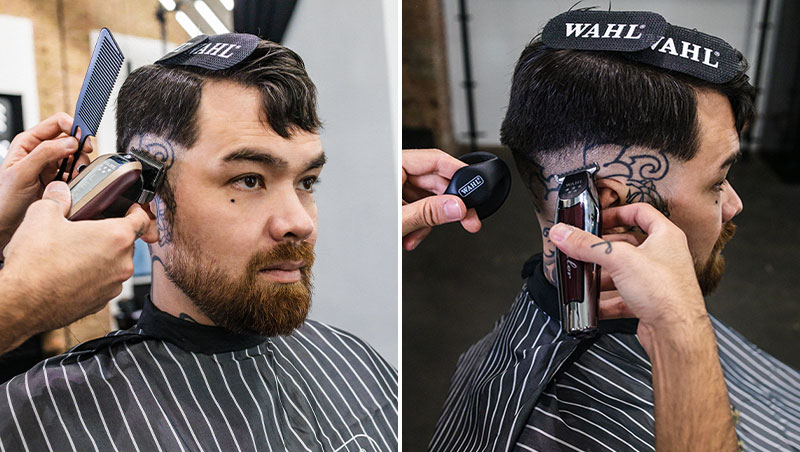 El uso de la herramienta adecuada es crucial. La WAHL LEGEND CORDLESS puede utilizarse para definir las zonas laterales. Los contornos junto a las orejas, la nuca y el corte del flequillo se definieron con la WAHL DETAILER CORDLESS, equipado con una cuchilla en T más ancha que proporciona líneas de corte excepcionalmente precisas. La WAHL FINALE proporciona transiciones suaves como la seda y un desvanecimiento perfecto. Durante el proceso de peinado se utilizó el secador WAHL BARBER DRYER.