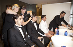 Tupés, peinados naturales y mucho volumen para empezar y dar una imagen más desenfadada, y engominados después para mostrar un look más clásico con el esmoquin, fueron los peinados que realizaron a los modelos el equipo de estilistas de Salerm Cosmetics Homme.