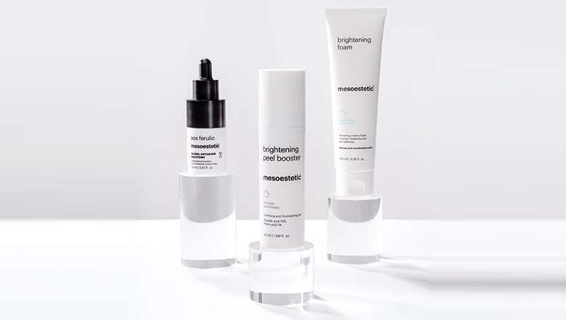 mesoestetic®, laboratório espanhol referência em cosmética e medicina estética, propõe três produtos para potenciar a luminosidade da pele nestas festas: o limpador brightening foam, o sérum antioxidante aox ferulic e o peeling brightening peel booster.