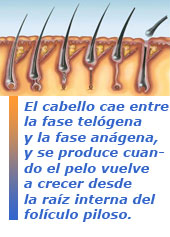 El cabello cae entre la fase telógena y la fase anágena, y se produce cuando el pelo vuelve a crecer desde la raíz interna del folículo piloso. Entonces empuja hacia afuera el pelo anterior, tal y como ocurre con el nacimiento de los dientes en sustitución de los dientes de leche.