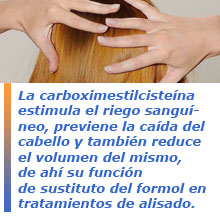 La carboximetilcisteína estimula el riego sanguíneo, previene la caída del cabello y también reduce el volumen del mismo, de ahí su función de sustituto del formol en tratamientos de alisado.