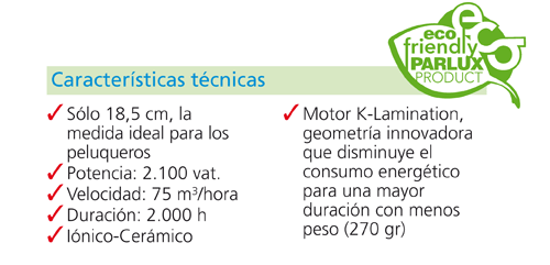 Moderno y tecnológico, este secador está diseñado para cuidar los cabellos, el medioambiente, la salud de los peluqueros y sus clientes. Incluye el sistema Ionic & Ceramic, que permite irradiar calor directamente dentro del cabello sin secar la estructura externa. Con menor peso y tamaño y una potencia de 2.100 vatios, este producto ecológico de "bajo impacto medioambiental" optimiza el ahorro energético.