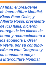 Al final, el presidente mundial Klaus Peter Ochs y Alberto Rossi, presidente de ICD Italia, hicieron entrega de las placas de honor y reconocimiento a los sponsors L'Oréal y Wella, por su contribución en este Congreso y su constante apoyo a Intercoiffure Mondial.