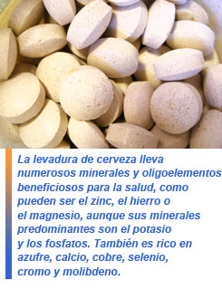 La levadura de cerveza contiene numerosos minerales y oligoelementos beneficiosos para la salud, como pueden ser el zinc, el hierro o el magnesio, aunque sus minerales predominantes son el potasio y los fosfatos. También es rico en azufre, calcio, cobre, selenio, cromo y molibdeno.