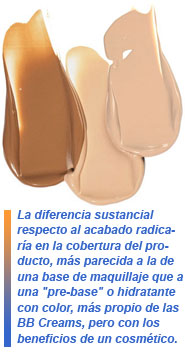 La diferencia sustancial respecto al acabado radicaría en la cobertura del producto, más parecida a la de una base de maquillaje que a una "pre-base" o hidratante con color, más propio de las BB Creams, pero con los beneficios de un cosmético.