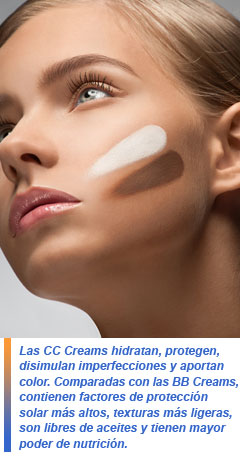 CC significa "Color Control", es decir, como las antecesoras BB Creams pero mejoradas. Hidratan, protegen, disimulan imperfecciones y aportan color, si bien contienen factores de protección solar más altos, texturas más ligeras, libres de aceites y con mayor poder de nutrición. Incluyen vitamina C, ayudando a aportar luminosidad al rostro.