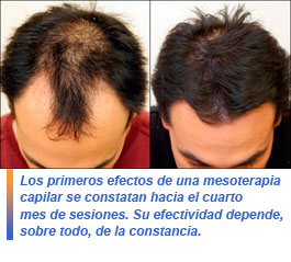 La media de tiempo que se alarga una mesoterapia capilar es de entre 5 meses a un año, en sesiones de unos 20 minutos, con una frecuencia máxima de dos cada semana. Sin embargo, los primeros efectos de una mesoterapia capilar se constatan hacia el cuarto mes de sesiones. Su efectividad depende, sobre todo, de la constancia. Si no se abandona, los tratamientos son permanentes, recuperando todo el brillo y la calidad de nuestro cabello.