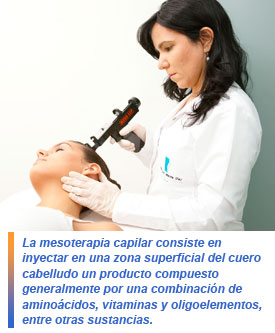 La mesoterapia capilar es un tratamiento estético muy sencillo de aplicar. Consiste en inyectar en una zona superficial del cuero cabelludo un producto compuesto generalmente por una combinación de aminoácidos, vitaminas y oligoelementos, entre otras sustancias. Estas pequeñas inyecciones nunca traspasan la piel, llegando a los tejidos que se quieren tratar, los inferiores, por difusión, de manera que se mantienen más tiempo sin dispersarse.