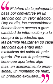 J.A.J.: El futuro de la peluquería pasa por convertirse en un servicio con un valor añadido. Hoy en día, los consumidores finales tienen acceso a gran cantidad de información y a la compra de productos que les permite realizar en su casa servicios que antes eran exclusivos del salón de peluquería. Cualquier mujer tiene una plancha en su casa que le permite conseguir peinados casi profesionales o puede aplicarse un tinte. Por eso la peluquería tiene que aportarles algo más: un asesoramiento profesional, un momento de relax, un producto exclusivo...