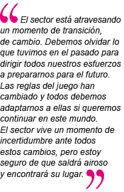 J.A.J.: Está atravesando un momento de transición, de cambio. Debemos olvidar lo que tuvimos en el pasado para dirigir todos nuestros esfuerzos a prepararnos para el futuro. Las reglas del juego han cambiado y todos debemos adaptarnos a ellas si queremos continuar en este mundo. El sector vive un momento de incertidumbre ante todos estos cambios, pero estoy seguro de que saldrá airoso y encontrará su lugar.
