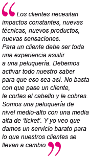 Para los clientes debe ser toda una experiencia asistir a una peluquería. Debemos activar todo nuestro saber para que eso sea así. No basta con que pase un cliente, le cortes el cabello y le cobres. Somos una peluquería de nivel medio-alto con un promedio alto de ticket. Y yo veo que damos un servicio barato para lo que nuestros clientes se llevan a cambio.