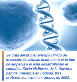 Se trata del primer ensayo clínico de inyección de células madre para este tipo de alopecia y lo está desarrollando el científico Kevin McElwee, de la Universidad de Columbia en Canadá, tras probarlo con éxito en ratones en 2003.