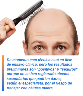 La técnica de implantación de células madre, según la investigadora Blanca Díaz-Ley, podría suponer un giro de 180 grados en el tratamiento de este tipo de alopecia, que es la más frecuente. "Para el paciente es mucho más cómodo que un trasplante de pelo. No se tiene que someter a una gran intervención, sino a una pequeña biopsia en un inicio y, luego, a un tratamiento que podría ser similar a una mesoterapia. Además, en los trasplantes de pelo no te pueden trasplantar mucho si tienes poco, mientras que esto es ilimitado; con tener un dedito de pelo es suficiente. De momento esta técnica está en fase de ensayo clínico, pero los resultados preliminares son "positivos" y "seguros" porque no se han registrado efectos secundarios que podrían darse, según el especialista, por el riesgo de trabajar con células madre.