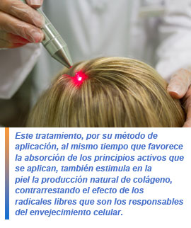 Se trata de una alternativa a la mesoterapia inyectada ya que, a diferencia de la anterior, ésta no es agresiva y no requiere pinchazos. Consiste en un dispositivo a modo de lápiz asistido electrónicamente, que aplicado en la superficie del cuero cabelludo, provoca la apertura de miles de micro canales, permitiendo de esta manera la penetración de principios activos a las capas más profundas de la piel. Este tratamiento, por su método de aplicación, al mismo tiempo que favorece la absorción de los principios activos que se aplican, también estimula en la piel la producción natural de colágeno, contrarrestando el efecto de los radicales libres que son los responsables del envejecimiento celular.