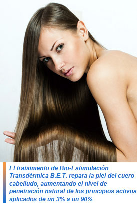 La terapia médico-estética B.E.T., de muy fácil aplicación y adecuada para todo tipo de cabello, combina la más avanzada tecnología instrumental con los principios activos más efectivos que, además, son aplicados utilizando precursores liposomados bajo nanotecnología. De esta forma, además de mejorar la regeneración y restauración celular y de estimular el colágeno para proteger el cabello de los radicales libres producidos por el sol, se consigue regular el sebo, hidratar el cabello y estimular el crecimiento capilar, mejorando notablemente la calidad del cabello.