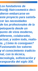 Inizi@ HairCosmetics, creadores en tendencia del cabello y especialistas en potenciar la belleza natural, es una nueva firma de cosmética profesional para el cabello que viene pisando fuerte y revolucionando el mundo de la peluquería, con un mensaje muy claro para el profesional peluquero: "No queremos vender producto, queremos ayudarte a potenciar tu imagen".