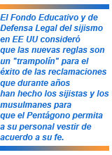 En el mismo sentido, aunque con un tono algo más crítico, se expresaron los grupos que pertenecen al sijismo, una religión india que es la novena del mundo en número de creyentes. El Fondo Educativo y de Defensa Legal del sijismo en EE UU consideró que las nuevas reglas son un "trampolín" para el éxito de las reclamaciones que durante años han hecho los sijistas y los musulmanes para que el Pentágono permita a su personal vestir de acuerdo a su fe. No obstante, este grupo dijo estar decepcionado por que los casos se resuelvan de manera individual y las normas no se apliquen en general para todos los militares.