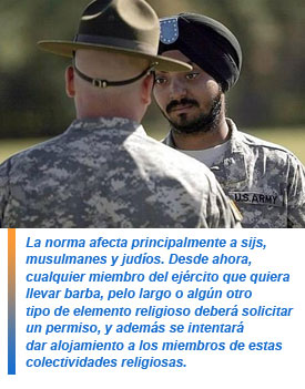 El Pentágono ha decidido permitir a los militares por primera vez llevar turbantes, kipá y otro tipo de elementos religiosos cuando vistan de uniforme. Se espera que las novedades afecten principalmente a los sijs, musulmanes, judíos y los miembros de otros grupos que lucen barba o prendas de ropa como parte de su religión. También podría beneficiar a los fieles de la Wicca y otras creencias que llevan tatuajes y piercings por razones religiosas.