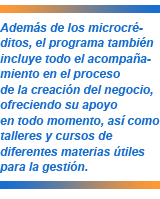 Además de los microcréditos, el programa también incluye todo el acompañamiento en el proceso de la creación del negocio, ofreciendo su apoyo en todo momento, así como talleres y cursos de diferentes materias útiles para la gestión, como trabajo en equipo, resolución de conflictos o comunicación.