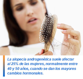 El porcentaje también varía según el tipo de alopecia del que se trate. La alopecia androgenética, o alopecia común, se inicia por la acción de las hormonas llamadas andrógenos (hormonas masculinas) sobre el folículo piloso. Este tipo de calvicie suele afectar al 25% de las mujeres, normalmente entre 40 y 50 años, cuando se dan los mayores cambios hormonales.