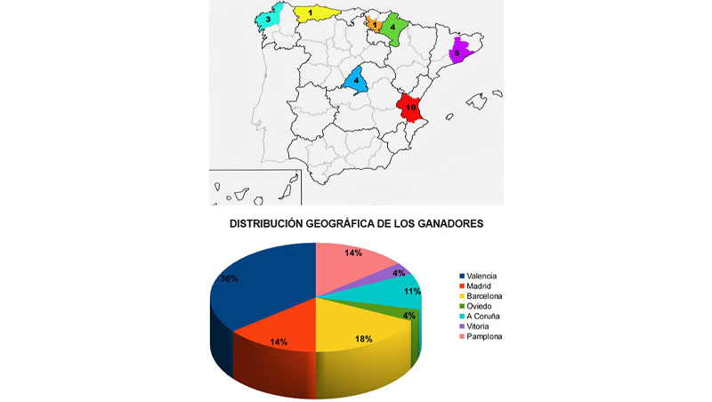 Aunque hay participantes procedentes de casi todas las provincias españolas, observamos que los ganadores se concentran en algunas zonas en particular. Valencia es la provincia que cuenta con más ganadores, 10 en total desde el principio de los premios, seguida por Barcelona con cinco, y Madrid y Pamplona con cuatro.