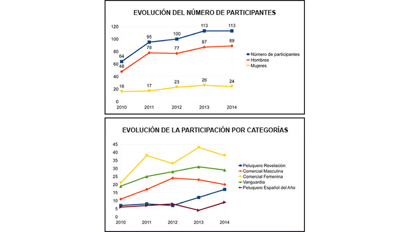 Por categorías, observamos como se registra un aumento progresivo en la participación, sobre todo en la categoría de Peluquero Revelación, que ha aumentado desde las siete colecciones de la primera edición hasta las 17 del año anterior. La categoría que muestra una participación mayor desde el comienzo de los premios es Colección Comercial Femenina, que desde la segunda edición ha superado las 35 colecciones participantes.