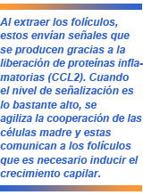 Al extraer los folículos, estos envían señales de estrés que producen una respuesta inmune. Las señales se producen gracias a la liberación de proteínas inflamatorias (CCL2). Dichas proteínas se encargan de reclutar células del sistema inmune (macrófagos). Se genera un efecto respuesta que incentiva la llegada de células inmunes a la zona. Estas células secretan moléculas de señalización que estimulan el ciclo de regeneración capilar.
