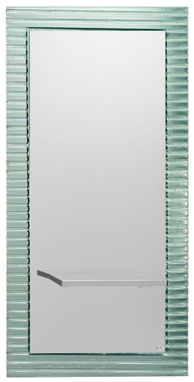 La colección incluye un tocador, de aire vintage provisto de marco de vidrio con textura ondulada y plata. El tocador incluye aro para colgar el secador de acero inoxidable y apoyapiés de acero.