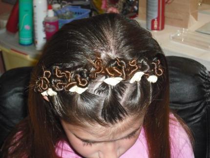 Alguna vez si el tocado que llevan es sencillo le acabo pasando la tenacilla a un par de mechones ondulandolos suavemente y meto las cintas que cuelgan entremedias.
