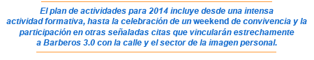 El plan de actividades para 2014 incluye desde una intensa actividad formativa, hasta la celebración de un weekend de convivencia y la participación en otras señaladas citas que vincularán estrechamente a Barberos 3.0 con la calle y el sector de la imagen personal, como el festival de tendencia urbanas Mulafest (Madrid, 26-29 de junio) y la feria Salon Look Internacional (Madrid, 17-19 de octubre).