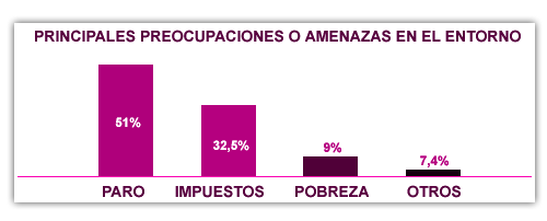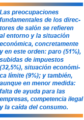 Las preocupaciones fundamentales de los directores de salón se refieren al entorno y la situación económica, concretamente y en este orden: paro (51%), subidas de impuestos (32,5%), situación económica límite (9%); y también, aunque en menor medida: falta de ayuda para las empresas, competencia ilegal y la caída del consumo.