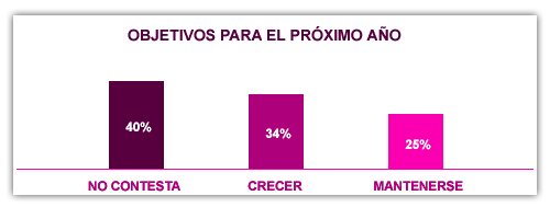Y entre los objetivos que se marcan para el año que viene, dentro de esta tónica de esperanza en unos atisbos de recuperación, sorprende el hecho de que para más de un 40% de los encuestados no se plantean una estrategia de cara a la crisis o a las perspectivas de recuperación del entorno, más bien opinan que sus objetivos están al margen o son independientes de los cambios en la economía global. Para el resto de usuarios los objetivos de cara al nuevo año 2014 son crecer (34%) o al menos mantener el negocio (25%).