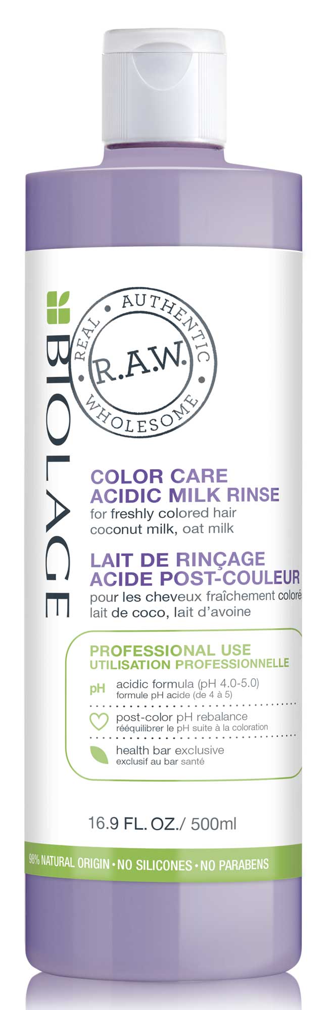 La nueva generación Biolage R.A.W. Color Care elaborada a base de ingredientes naturales, es capaz de mantener la vitalidad del color fresca hasta cuatro semanas, siempre que se haga un uso combinado del champú y el acondicionador. Con esta nueva línea de cuidado capilar, los consumidores pueden recibir en el salón un servicio sostenible, natural y efectivo. Biolage R.A.W. Color Care permite además que el proceso de coloración sea mucho más completo gracias a la Color Care Acidic Milk Rinse, un producto que se aplica solo en estos, los salones de peluquería, tras la coloración, con el que conseguir recuperar y cerrar la cutícula por más tiempo, así como optimizar el pH y conseguir un color más brillante.