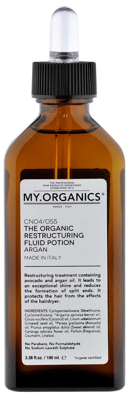My.Organics ha desarrollado The Organic Restructuring Fluid Potion Argán, ideado para proteger el cabello del calor y aportar un extra de brillo. Se trata de un producto orgánico biodegradable, es decir, cuando el cabello se lava el producto desaparece por completo de él, sin obstruirlo, lo que lo diferencia de otros aceites del mercado que sí contienen siliconas.