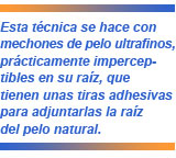 Separamos el pelo y con la ayuda de la parte del mango fino de un peine las vamos aplicando. Colocamos el adhesivo entre medio del cabello y se sella mediante una suave presión. En ningún caso este adhesivo contiene sustancias químicas que dañan el cabello.